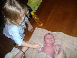Macie and Gavin in stuff with Lilah, the happier they are. Lilah was happy at first, but was screaming before it was all over with. Only a few more "towel" baths before her cord falls off.