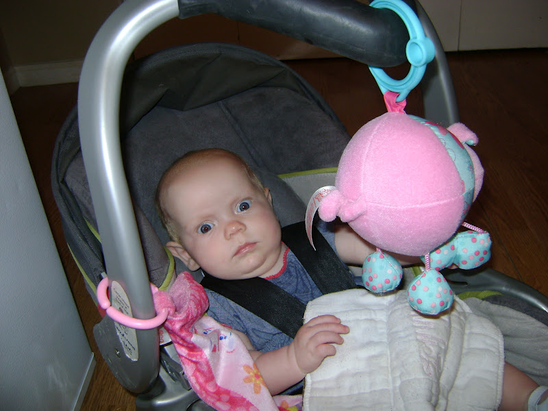 Lilah's 4 Month Check Up: This afternoon, I took Lilah to see Dr. Voyles for her 4 month check up. She weighs 13 pounds 13 ounces (42nd percentile) and is 24 inches long (28th percentile). Her percentages pretty much stayed the same from her 2 month appointment. Dr. Voyles was happy with her progress. We talked about her eating/sleeping habits and how they are out of whack right now. We plan to increase her bottles to 6ounces and increase the time inbetween to 4 hours. Once she adjusts to this schedule, we are going to add veggies. Dr. V pointed out that the little white bumps on her arms and back were called "milk bumps". He said they will go away. There was only one concern from the visit. When Dr. V looked in her diaper, he noticed that she had an adhesion. There is a more technical term for it, but basically, we had to get some cream to put on it twice a day. Hopefully, this will fix the problem. Lilah did pretty well with her shots and stopped crying once I picked up her up. She will go back again in 2 months!